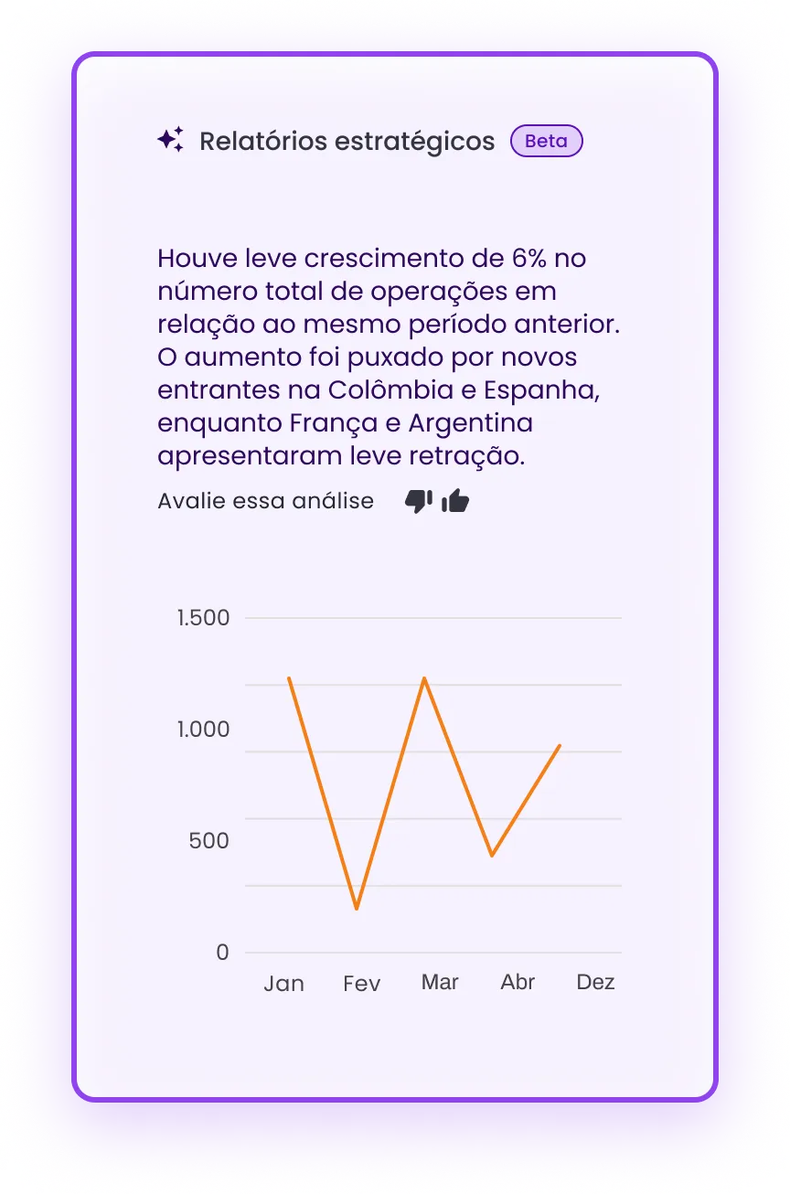 Com o apoio dos nossos agentes de IA, explore mercados com alto potencial e baixa concorrência. Identifique destinos estratégicos, avalie riscos e ganhe vantagem competitiva para exportar com mais precisão.