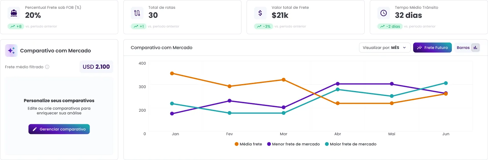 Monitore a evolução histórica dos fretes por região, tipo de carga e sazonalidade. Antecipe riscos e planeje com precisão.