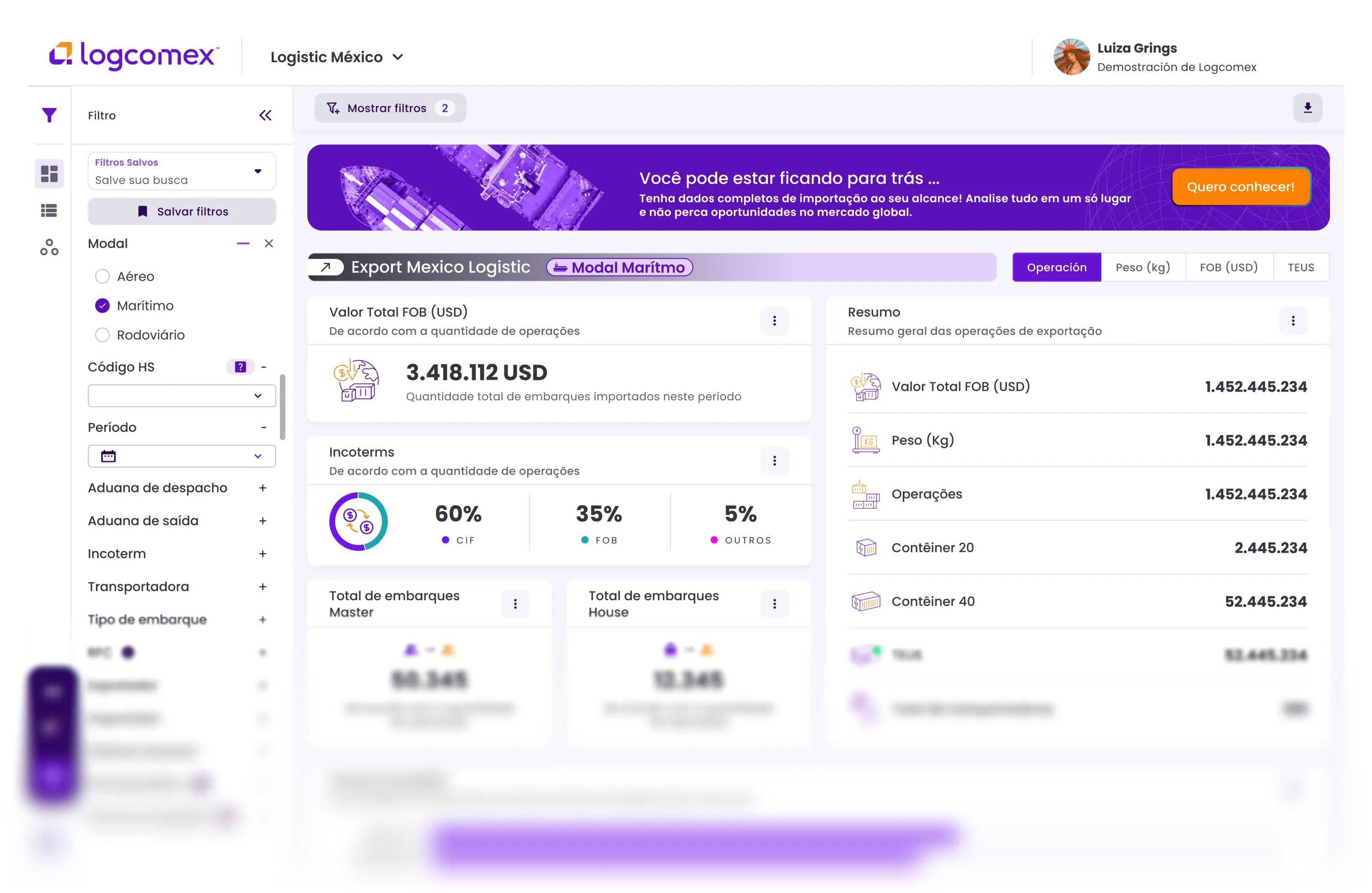 Analise o volume, frequência, modais e parceiros antes mesmo da proposta comercial.